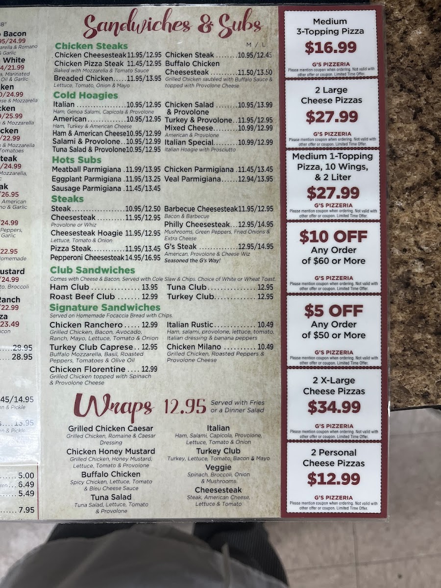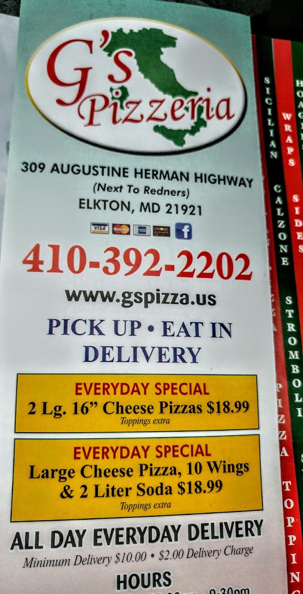 G's Pizzeria Elkton MD Menu